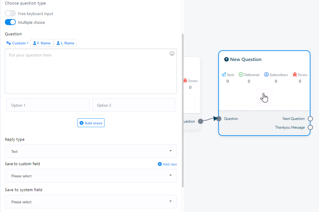 4. Double-click on the `New Question` component to access two buttons: `Free Keyboard Input` and `Multiple choice`. These buttons determine the type of questions you want to ask.